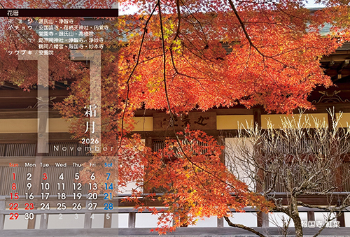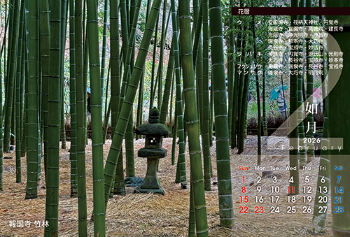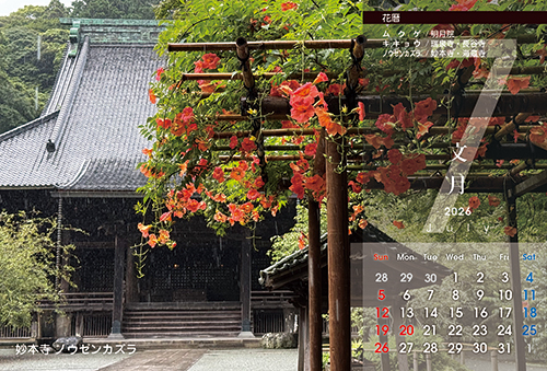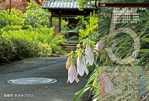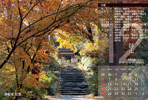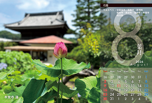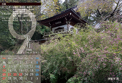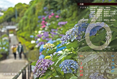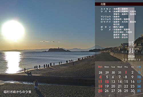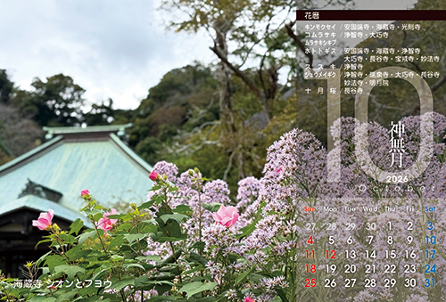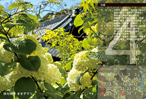 美しい鎌倉の鼻や風景をカレンダーに!毎年人気の卓上カレンダー2026年版です。 表紙緑が眩しい覚園寺の青紅葉たち。青々とした木々からは、エネルギーをもらい爽やかな気持ちになれそうです。 1月◇稲村ガ崎からの夕景 2月◇神秘的な雰囲気の報国寺の竹林です。こちらでは、抹茶と和菓子を味わいながら静寂を楽しむことができます。 3月◇段葛の桜 4月◇浄光明寺のオオデマリ。手毬のような白い花姿から、「華やかな恋」などの花言葉があります。 5月◇海蔵寺 ホタルブクロ ベルのような形をした花が、うつむくように連なってかわいらしいです。 6月◇成就院のアジサイ。石段の両側にカラフルなアジサイが美しく彩ります。 7月◇妙本寺のノウゼンカズラ。シトシト雨の中でも美しいオレンジ色のノウゼンカズラに目を奪われます。 8月◇本覚寺の蓮。太陽に向かって真っ直ぐに伸びる蓮から、元気がもらえるような気がします。 9月◇浄智寺の萩。うつむき加減に咲く花姿や、細くてしなやかな枝の様子から、花言葉は「内気」「柔軟な精神」です。 10月◇海蔵寺の紫苑と芙蓉。淡紫色の可憐な紫苑と大きなピンクの大輪の花、芙蓉のコラボレーションです。 11月◇報国寺の紅葉。真っ赤に染まった葉が美しいです。 12月◇浄智寺の紅葉。山門までの参道が、美しい紅葉のトンネルのようです。